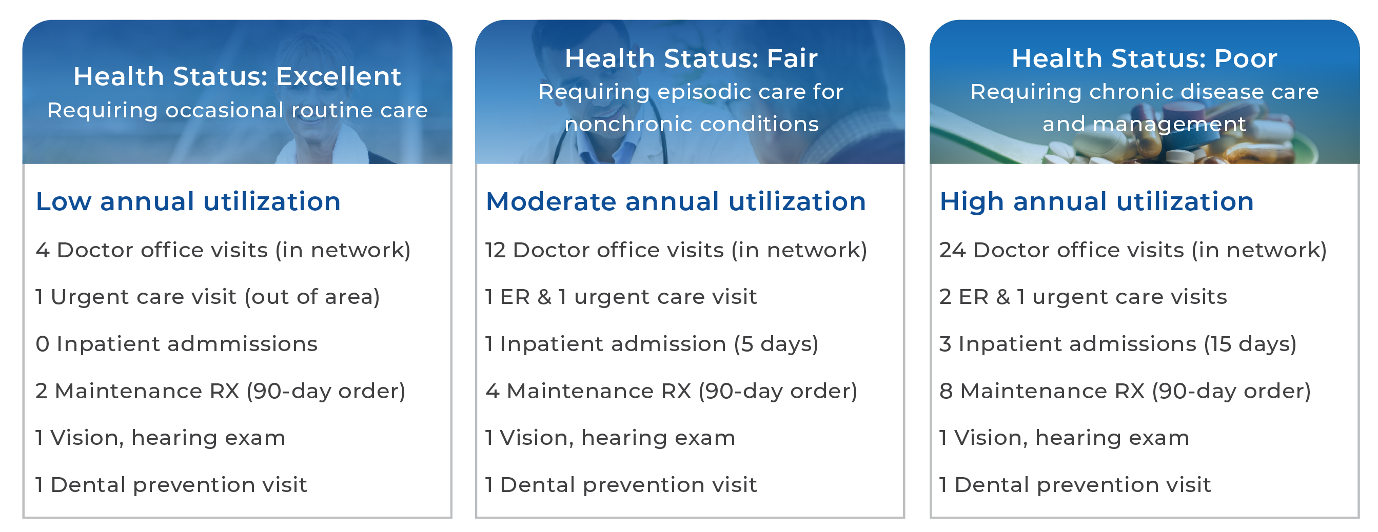 There they define three states of health—excellent, fair, or poor—very concretely in terms of the number of doctor visits per year, number of hospital admissions, and number of prescriptions.
