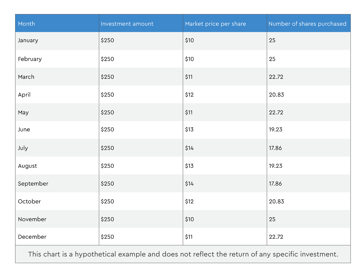 However, if you calculate your average cost per share over the same period ($3,000 divided by 259 shares), you’ll see that on average, you’ve paid only $11.58 per share.